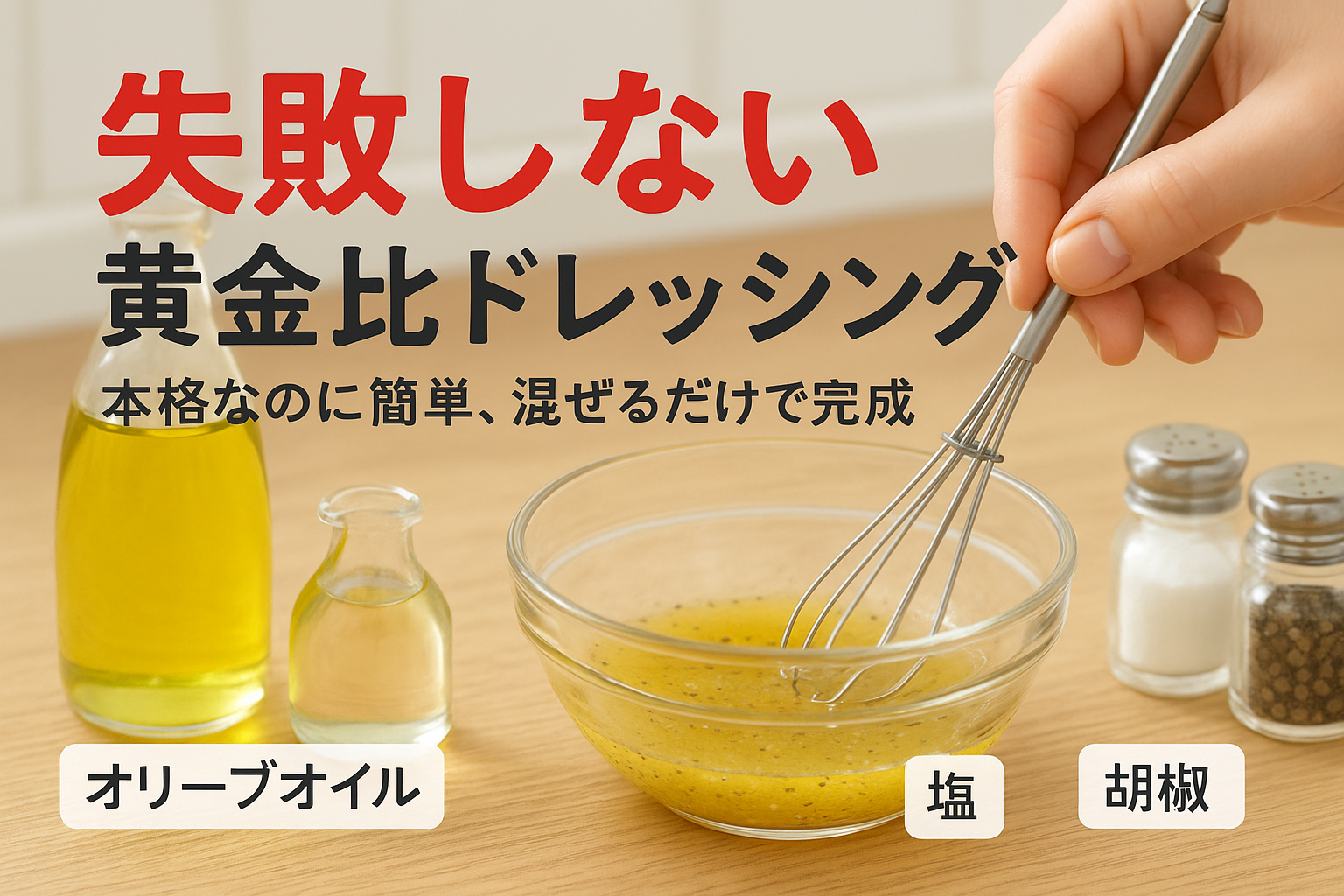 サラダが水っぽくなる、酸味が強すぎる、毎回味がブレる—そんな悩みは「比率」と「手順」で解決できます。一般的にドレッシングは油:酢=2:1前後が基準ですが、塩は総量の約1%が目安。まず酸に塩をしっかり溶かし、次にオイルを少しずつ加えて混ぜるだけで安定した味に近づきます。強い酸味が苦手なら、はちみつを小さじ1/2から微調整がおすすめです。